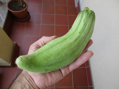 As I wrote in an another post, after harvesting the first fruits, my Pelosello vine has yielded very bitter pepos. And this is very unusual for carosellos. A few days ago, I picked a 350 gram fruit (pics 1 to 3). Too big. It sometimes happens that carosellos escape the gardener's sight: their camouflage with leaves is often perfect.